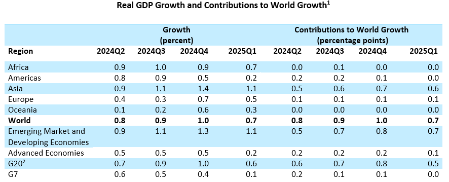Asia continued to provide the main impetus, increasing by 1.1 percent and contributing 0.6 percentage points to global growth, even as it decelerated somewhat from the very robust 2024Q4 growth. Europe also saw more muted gains (0.5 percent) than in the previous quarter, contributing 0.1 percentage points to World growth. Expansion in the Americas slowed to 0.2 percent with the region making only a marginal contribution to overall growth. Africa grew by 0.7 percent, while in Oceania, GDP grew by 0.3 percent, with each region also making marginal positive contributions.
